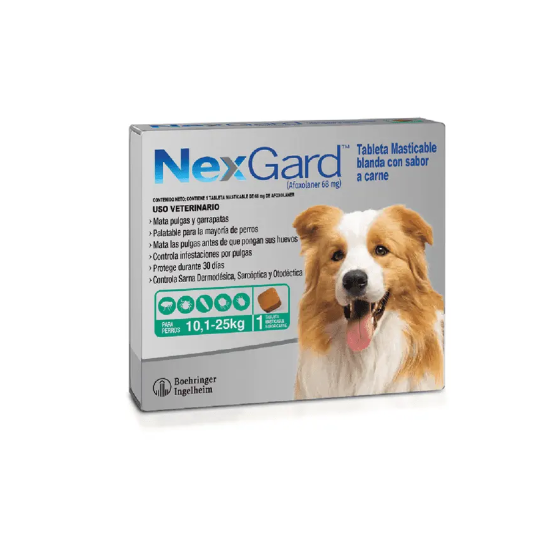 Nexgard ® es una tableta masticable, indicada en perros para el tratamiento y control de infestaciones por pulgas y garrapatas. Puede utilizarse sin problemas en perros con alteraciones en la piel y como tratamiento para el control de dermatitis alérgica por pulgas.