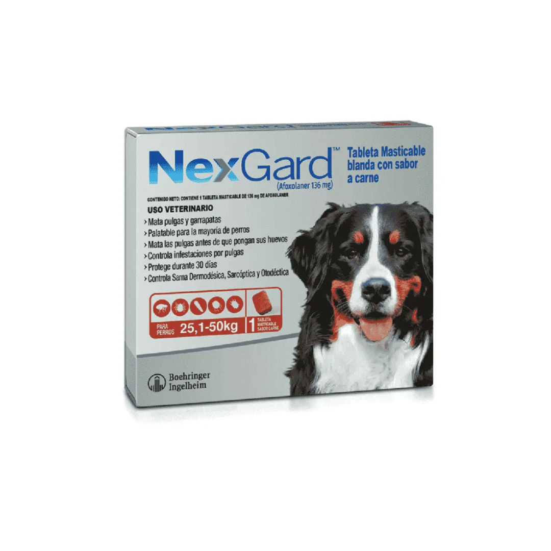 Nexgard ® es una tableta masticable, indicada en perros para el tratamiento y control de infestaciones por pulgas y garrapatas. Puede utilizarse sin problemas en perros con alteraciones en la piel y como tratamiento para el control de dermatitis alérgica por pulgas.
