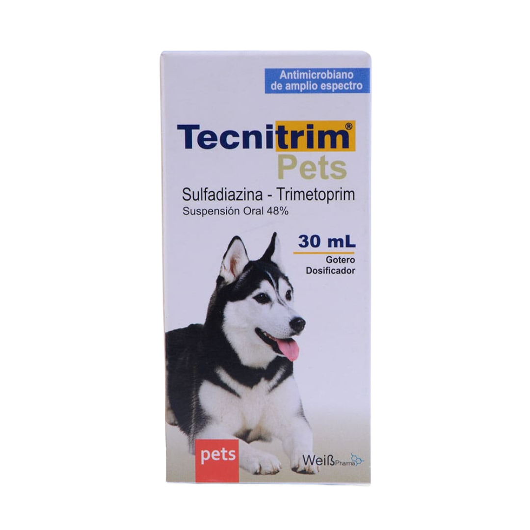 Tecnitrim Pets es un antibacteriano de amplio espectro a base de Sulfadiazina Sódica y Trimetoprim Micronizado, especializado en el tratamiento y control de enfermedades causadas por bacterias gram positivas y gram negativas. Tecnitrim Suspensión Oral Gotero 30 ml.